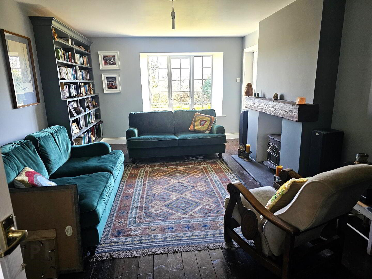 Wood burning stove with back boiler. Built in shelving. French doors through to kitchen / dining room. Wooden flooring.