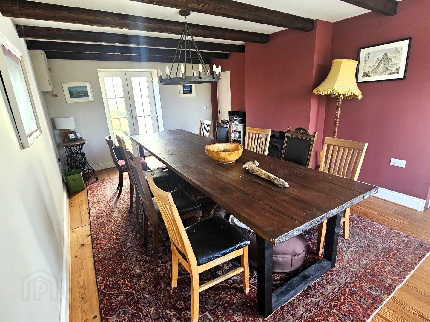 Wood burning stove. Beam ceiling. French door leading to rear paved area. Solid pine flooring.