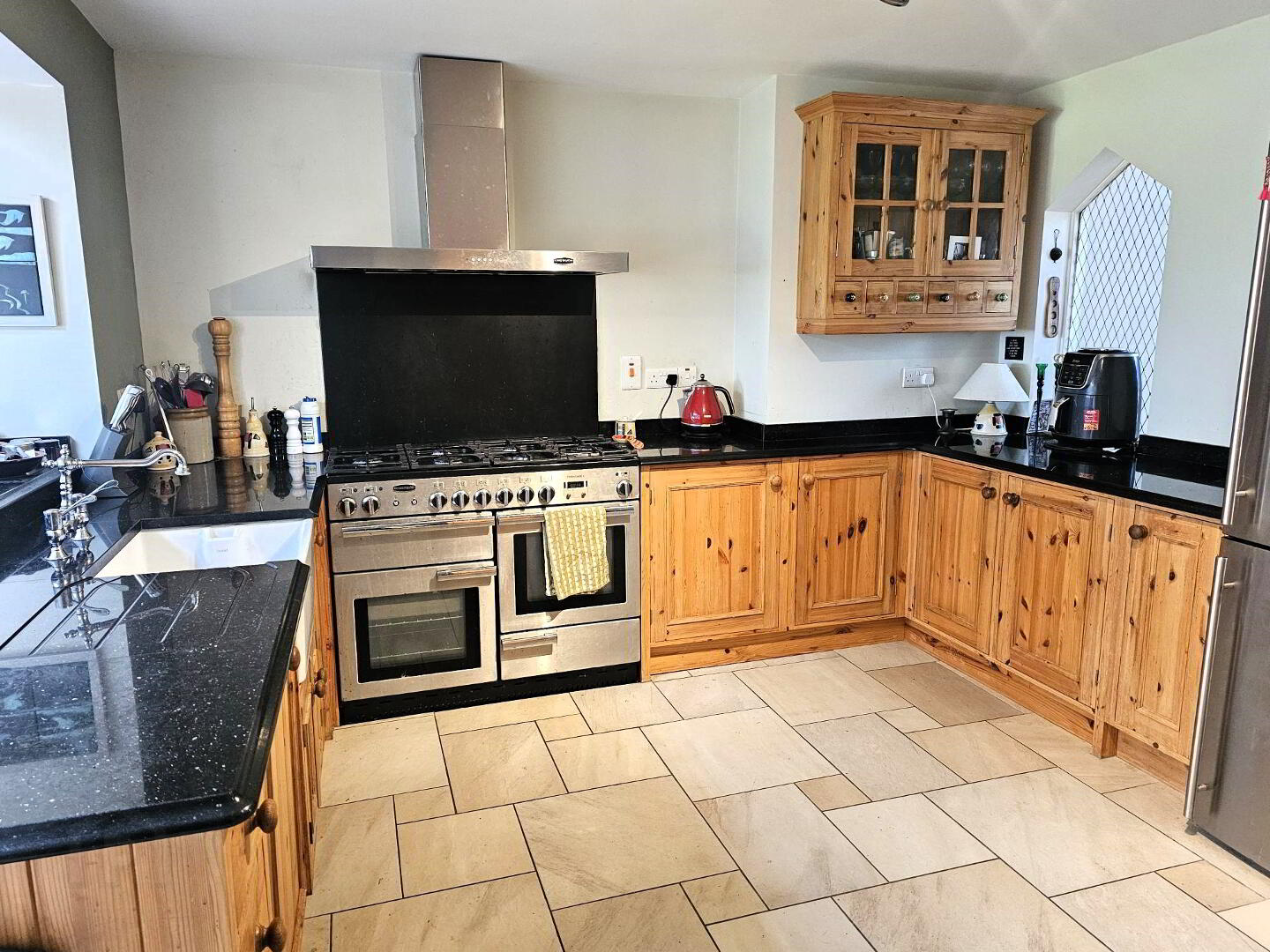 Pine units with glazed unit. Belfast sink. Granite worktop. Rangemaster Stove with 6 gas rings and double electric oven. Extractor fan. Tiled flooring.