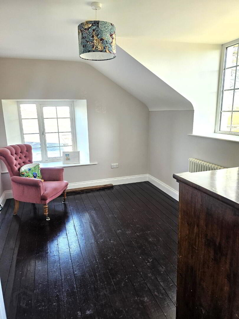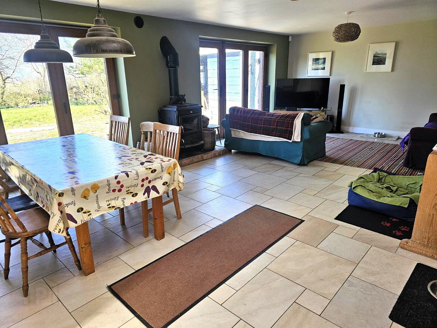 Large wood burning stove with back boiler. Double opening bifold door. Velux window. TV point. Tiled flooring.