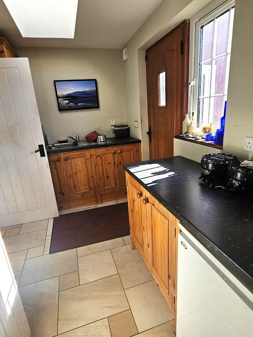 Storage cupboards. Stainless steel sink with drainer and mixer taps. Velux window. Central heating switch. Tiled flooring. Solid wooden rear door.