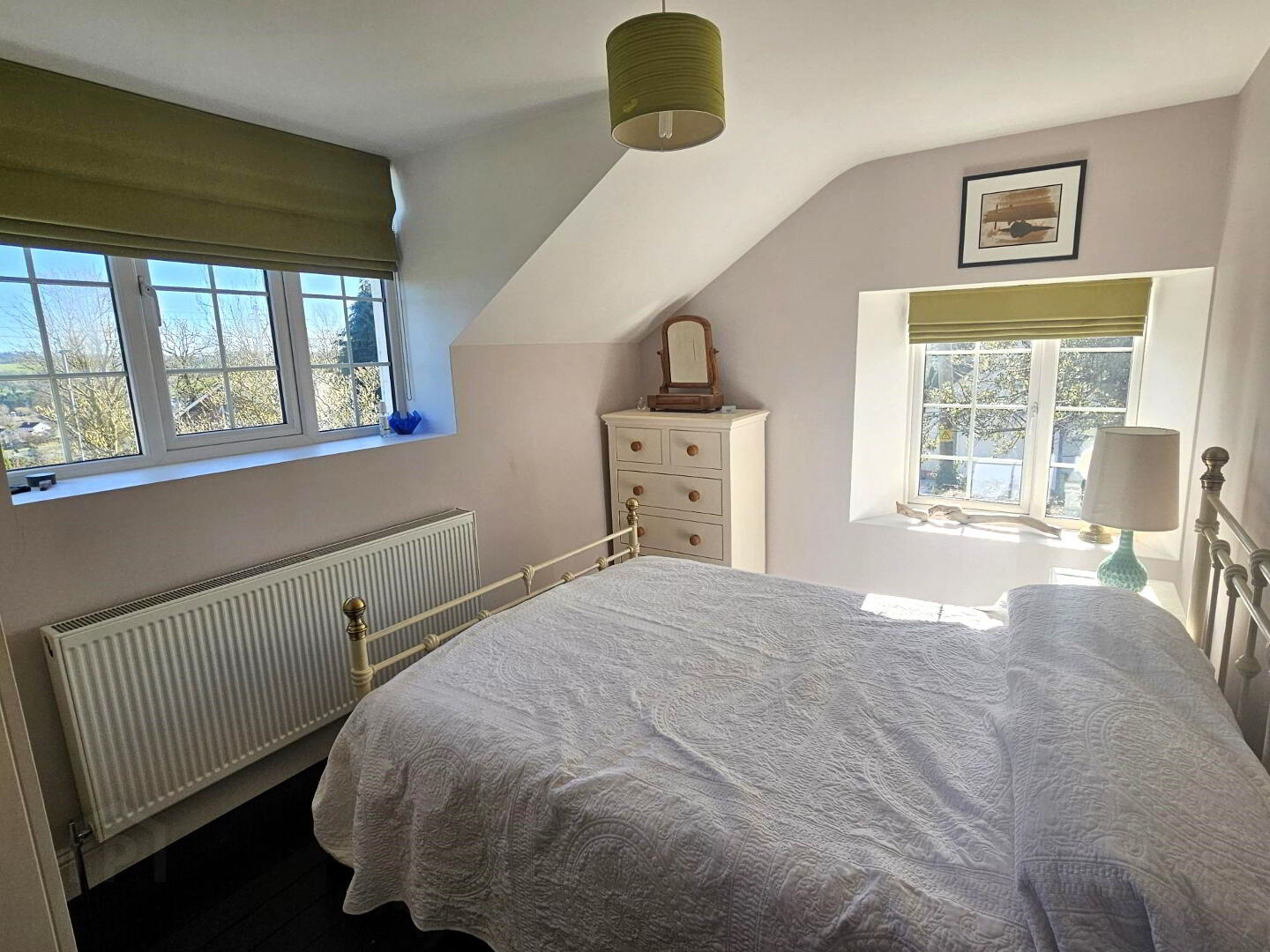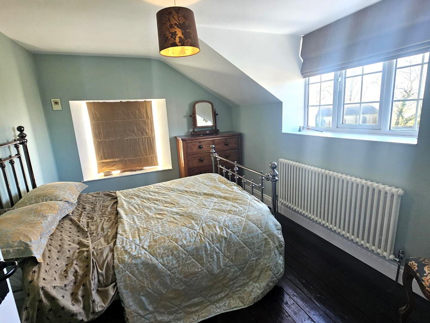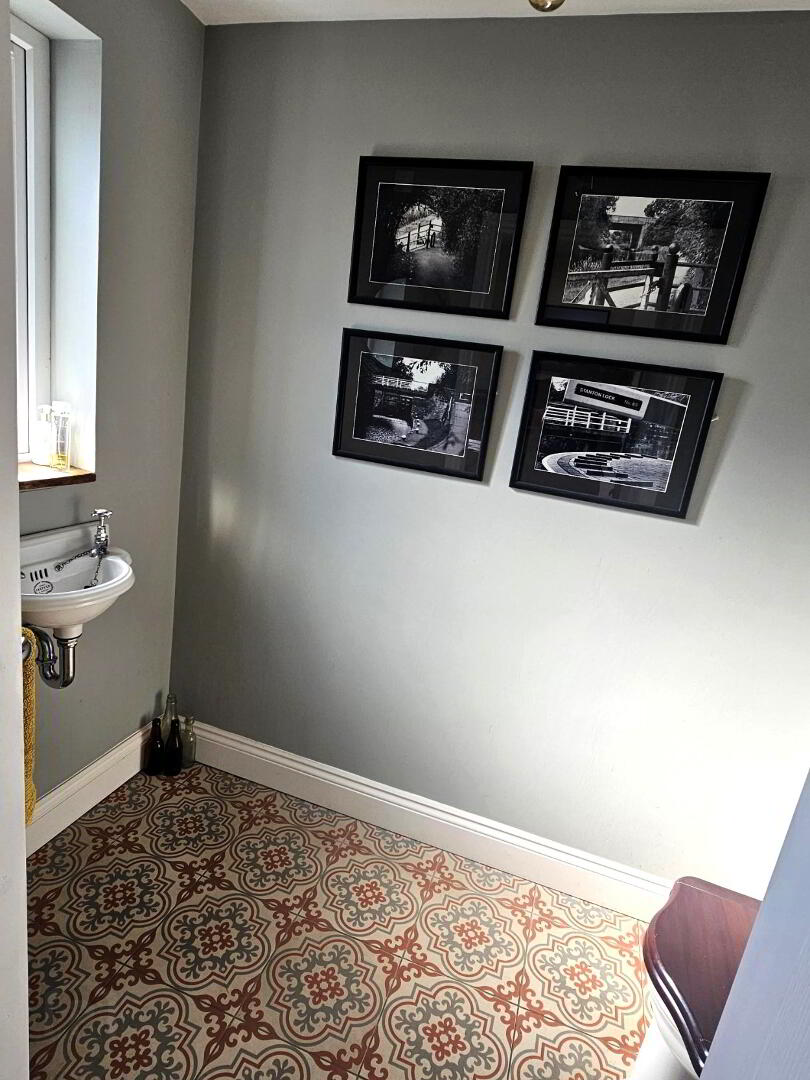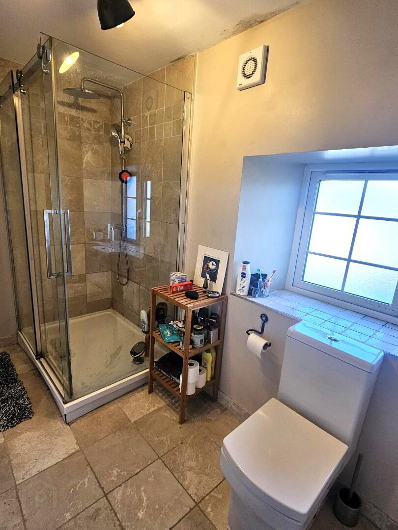 Large walk in shower with drencher fitting. Free standing bath, wc and whb. Heated towel rail. Tiled flooring.