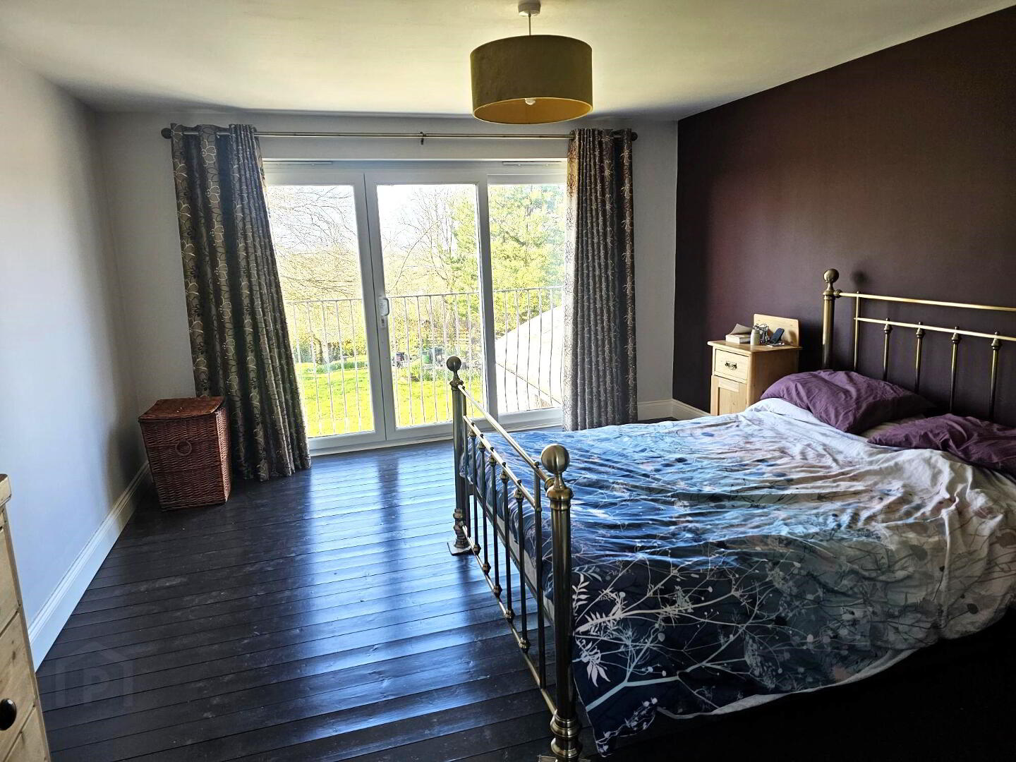 Juliet balcony with white PVC door. Wooden flooring.