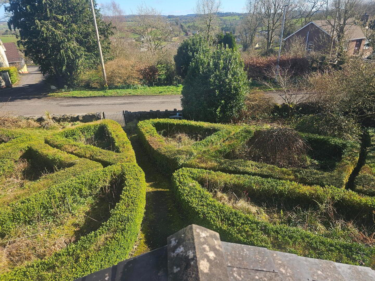 Garden: Boxwood hedge to front. Rear garden in lawn with boundary wall, fencing and mature trees.